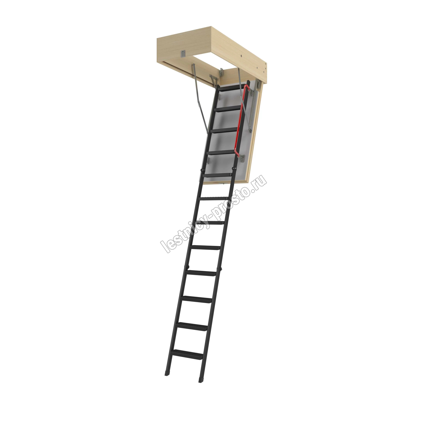 Улучшенная модель металлической складной лестницы. Утепленная крышка люка белого цвета (толщина крышки люка с утеплителем - 66 мм) позволяет устанавливать лестницу даже в помещениях с значительными перепадами температур.
