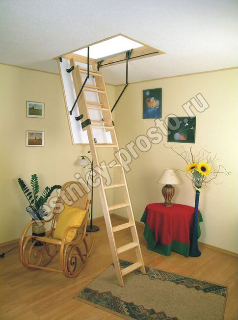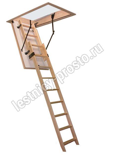 Лестница раздвижная двухсекционная, изготовлена из сосны. Термоизоляционная крышка типа "сэндвич" имеет усиленную теплозащиту, облицована с двух сторон ДСП белого цвета. По контуру короба имеется уплотнитель. Все металлические элементы лестницы покрыты порошковой краской, ступени лестницы имеют антискользящие насечки и закреплены в столярное соединение «ласточкин хвост», что позволяет выдерживать нагрузку 150 кг. При раскладывании лестницы нет вылета за пределы короба, что позволяет использовать эту модель лестницы в таких помещениях, где невозможно использовать чердачные лестницы с большим разбегом открытия. Удобна для эксплуатации на большой высоте. Деревянный стержень для открывания лестницы в комплекте..