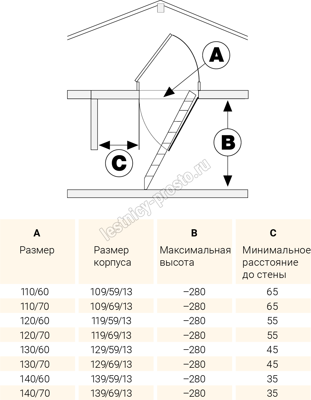 Возможна установка лестницы в разных по высоте помещениях, в пределах от 220 до 280 см.