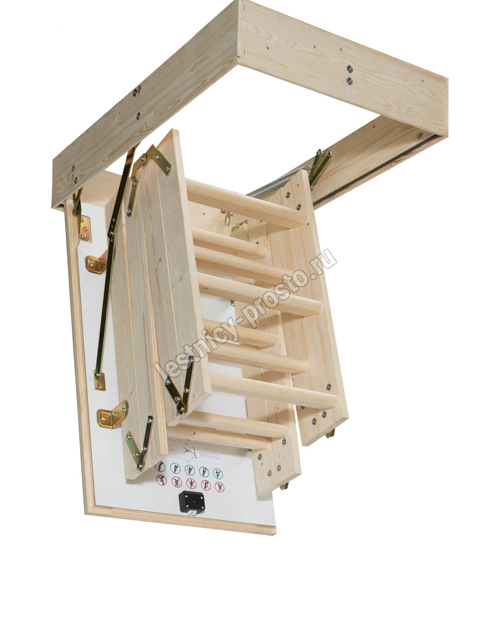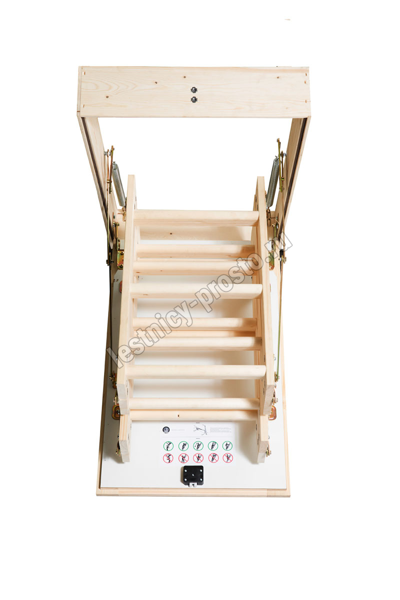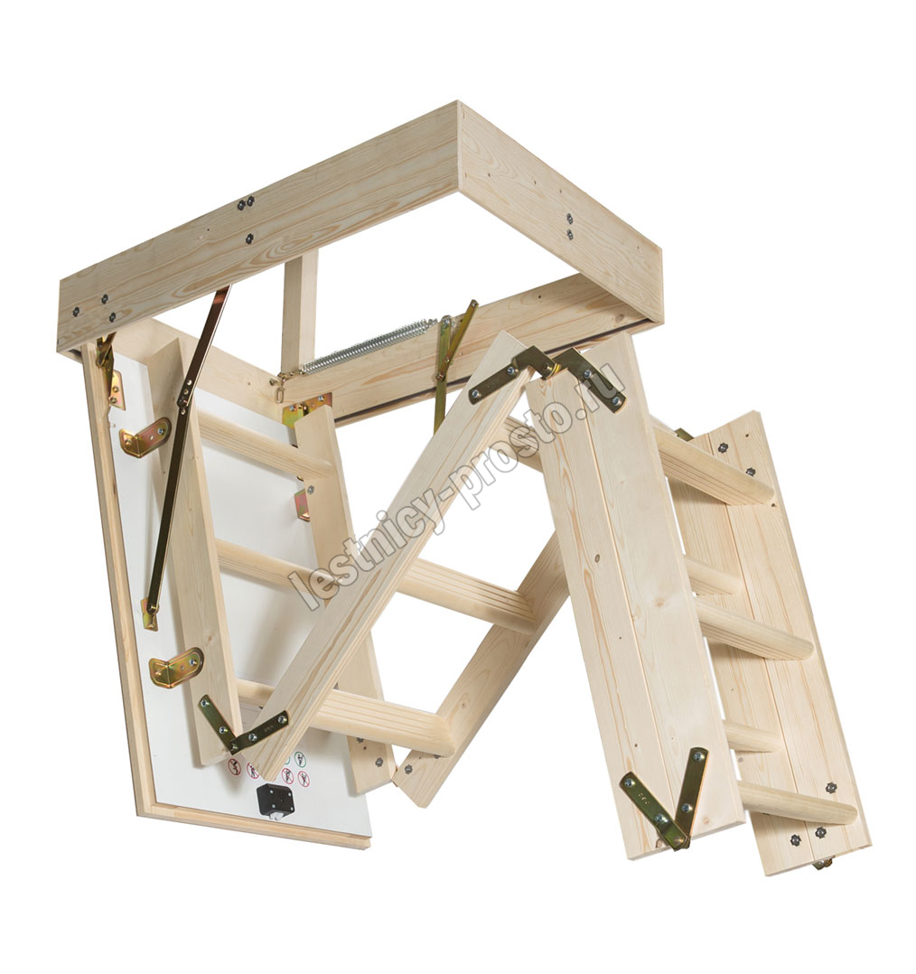 Четырехсекционная складная лестница из ели. Высота лестницы от потолка до пола: 2870 мм, с помощью дополнительной секции можно увеличить высоту до 3300 мм