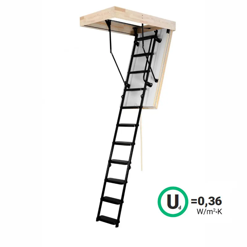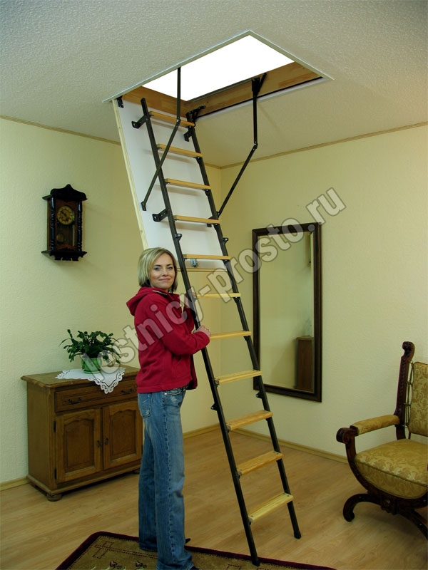Модель STALLUX идеально подходит для условий, когда чердак утеплен и не требует дополнительной теплоизоляции. Направляющие изготовлены из стали, а ступени - из сосны. Термоизоляционная крышка типа "сэндвич", толщиной 30 мм, утеплена пенопластом, облицована с двух сторон ДВП белого цвета.