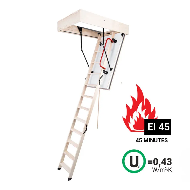 Чердачные лестницы EI45 POLAR имеют класс огнестойкости - EI45 (соответствует огнезащите в течении 45 минут),  они идеально подходят для установки в помещениях подверженных возгоранию, их противопожарные свойства позволят эффективно изолировать помещение, в котором возник пожар, от чердака, тем самым предотвращая дальнейшее распространение огня.
