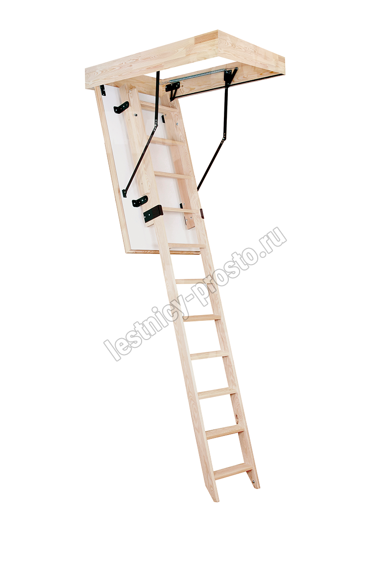Лестница раздвижная двухсекционная, изготовлена из сосны. Термоизоляционная крышка типа "сэндвич" имеет усиленную теплозащиту, облицована с двух сторон ДСП белого цвета. По контуру короба имеется уплотнитель. Все металлические элементы лестницы покрыты порошковой краской, ступени лестницы имеют антискользящие насечки и закреплены в столярное соединение «ласточкин хвост», что позволяет выдерживать нагрузку 150 кг. При раскладывании лестницы нет вылета за пределы короба, что позволяет использовать эту модель лестницы в таких помещениях, где невозможно использовать чердачные лестницы с большим разбегом открытия. Удобна для эксплуатации на большой высоте. Деревянный стержень для открывания лестницы в комплекте..