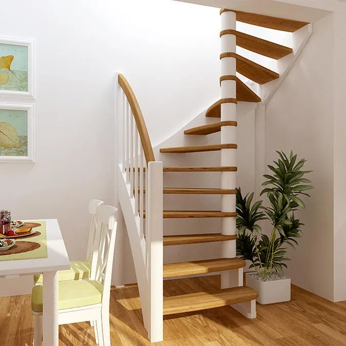 Компактная лестница из дерева. Удобный подъем засчет забежных ступеней и ограждений, которые входят в стандартную комплектацию. В стандартной комплектации столбы квадратные, балясины точёные. Элементы лестницы и ограждения поставляются в разобранном виде без какого-либо покрытия.