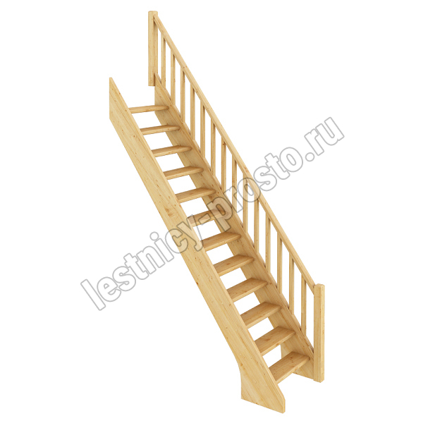 Базовый комплект включает в себя деревянные элементы лестницы и ограждения без какого-либо покрытия. Ограждение можно установить справа или слева.