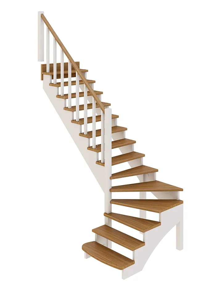 В производстве лестницы К-001м/1 под покраску используется сосна с небольшими изменениями цвета, что практически не влияет на ее механические свойства и почти незаметно при покраске в темные цвета. Базовый комплект включает в себя элементы лестницы и ограждения без какого-либо покрытия.