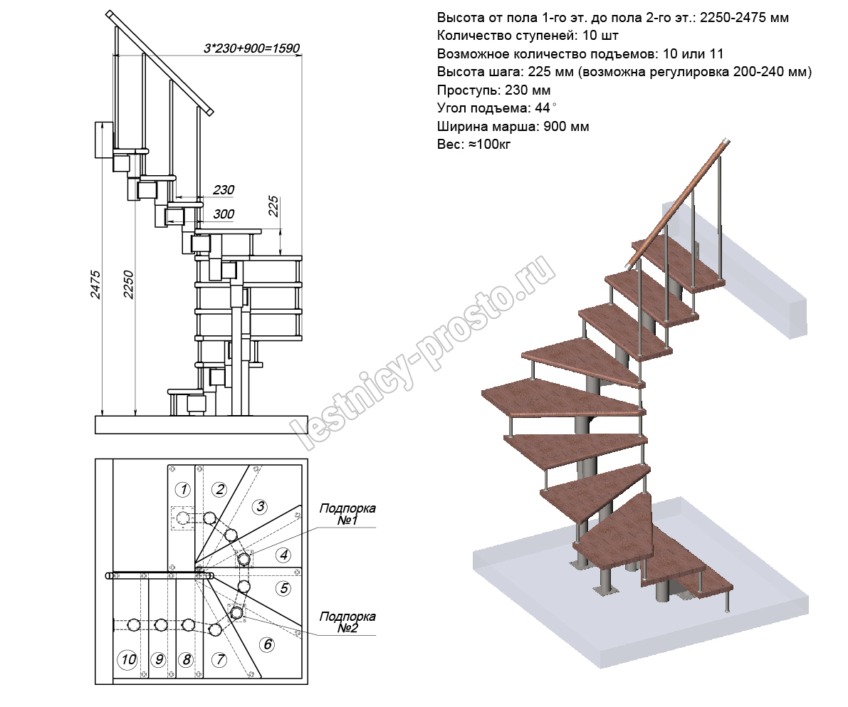 Высота лестницы 2250 - 2475 (10 ступеней) мм