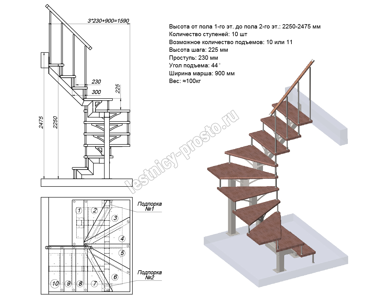 | Лестница PROSTO MONO П-образная, h225 см, ступени хвоя |