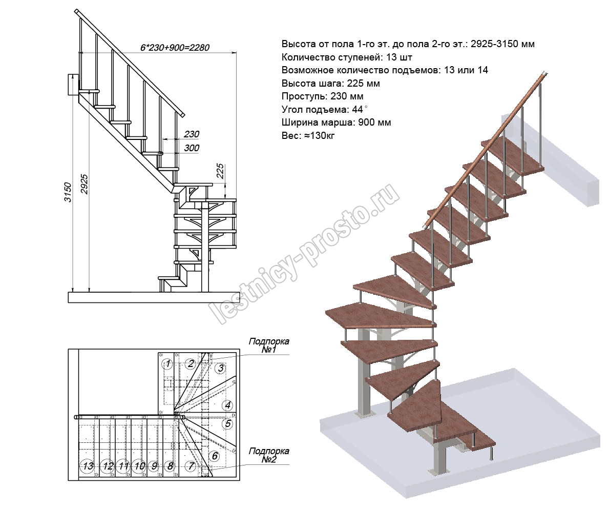 | Лестница PROSTO MONO П-образная, h315 см, ступени хвоя |
