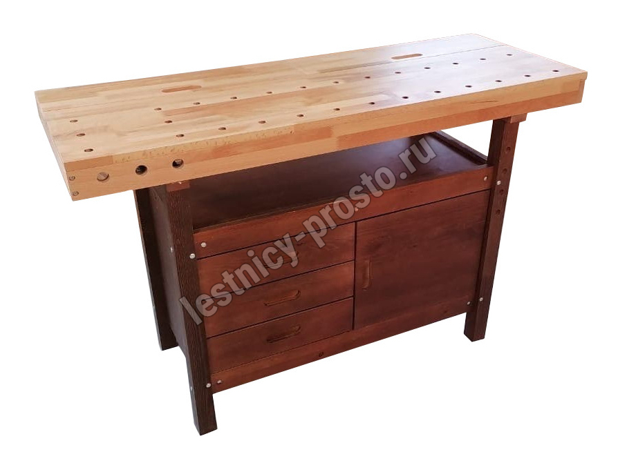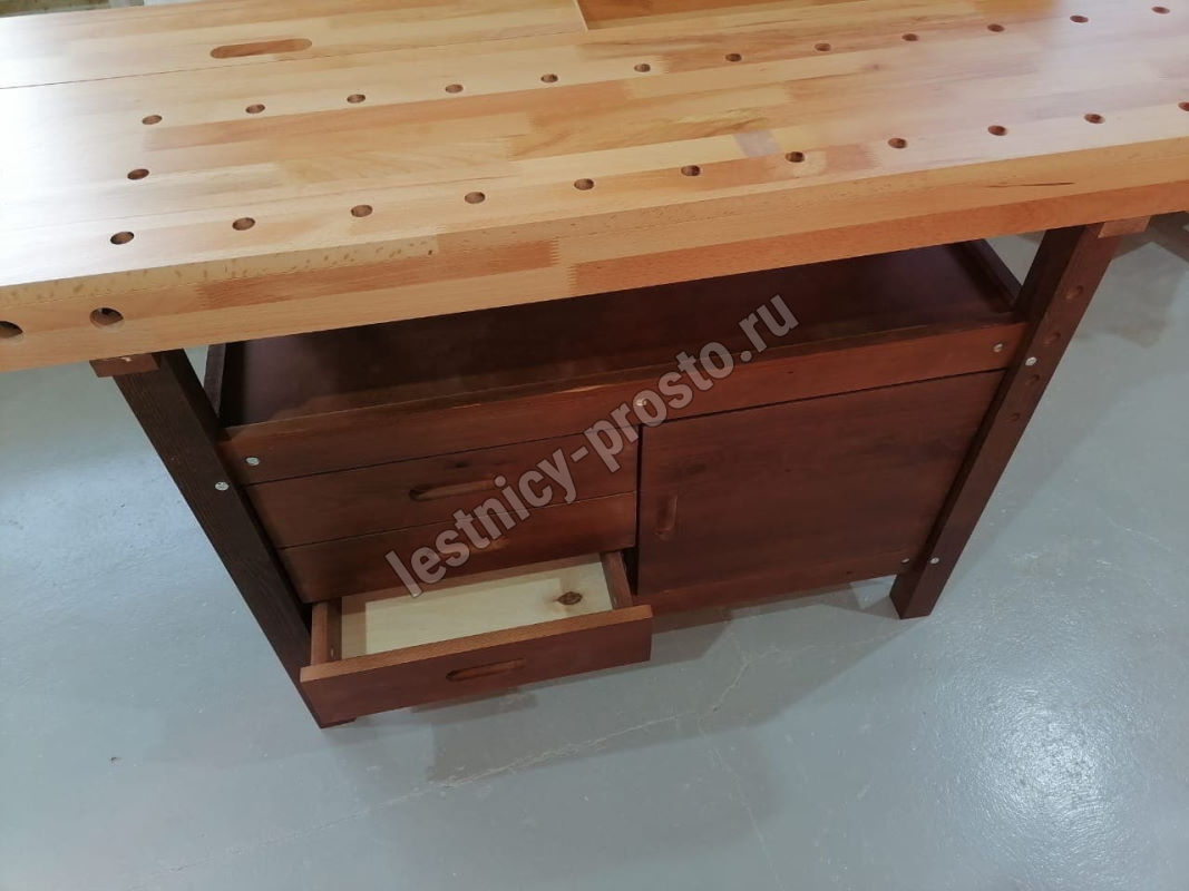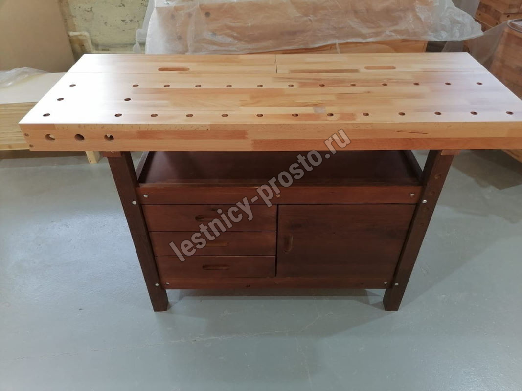 Комплектация: 2 комплекта тисков, 2 пенала в столешнице, 3 ящика, 1 шкафчик, полка.