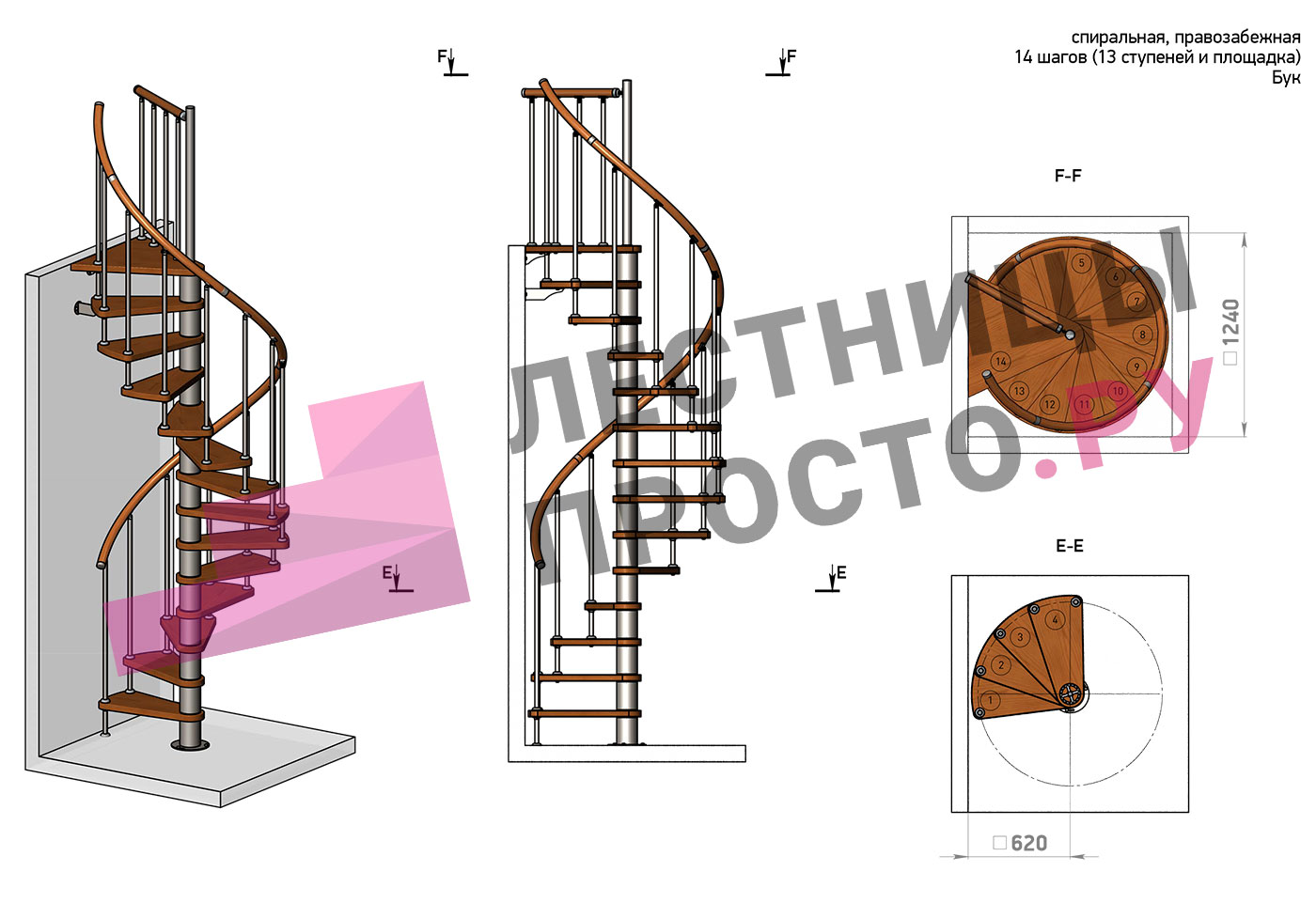 Решение о направлении поворота принимается при сборке лестницы - универсальная конструкция позволяет собрать правозабежную и левозабежную лестницы. Высота ступеней регулируется с шагом 3 мм. в пределах 217-247 мм., благодаря чему, лестница прекрасно подгоняется под необходимую высоту.