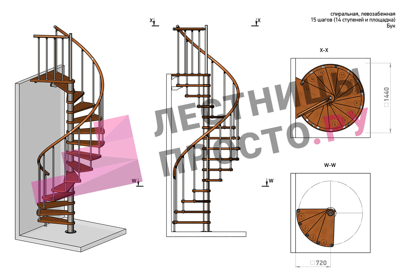 Левая, d=140см, 14 ступеней + площадка
