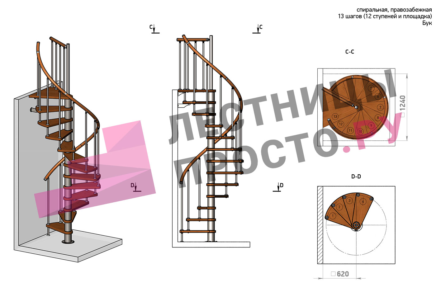 Правая, d=140см, 13 ступеней + площадка