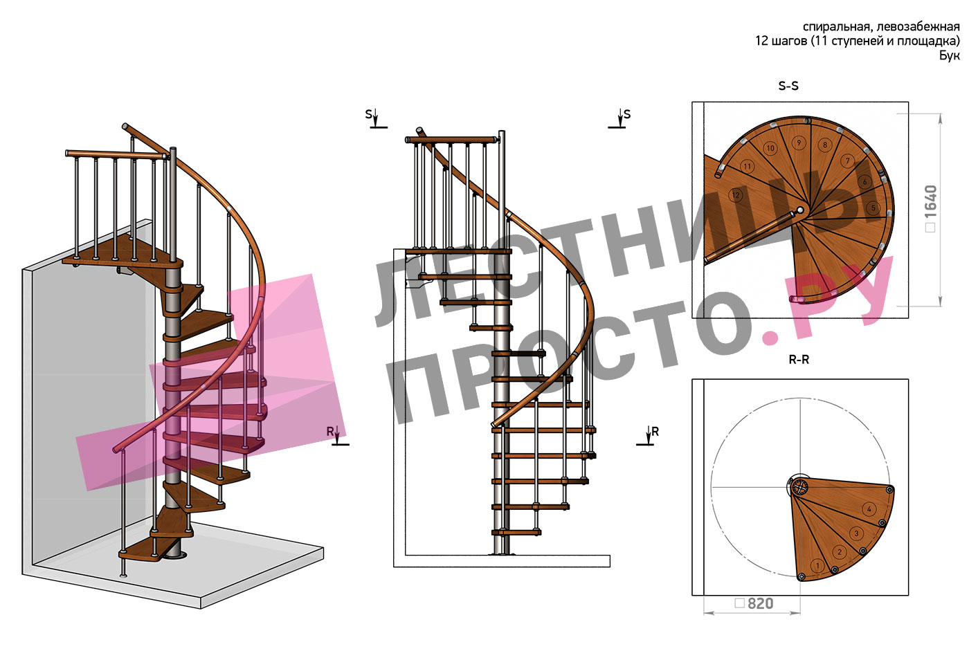 Левая, d=120см, 12 ступеней + площадка