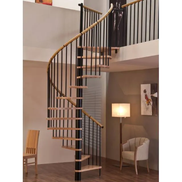 Ступени лестницы изготовлены из бука по технологии MULTIPLEX и покрыты износостойким защитным лаком. Лестница монтируется как по часовой стрелке, так и против. Возможен монтаж в круглый или квадратный проём. Ограждение: стальные трубки, Ø25 мм RAL 9006. Поручень: гибкий цельный ПВХ-поручень Ø40 мм серого цвета. Конструкция и балюстрада окрашены порошковым способом в серый цвет (RAL 9006).