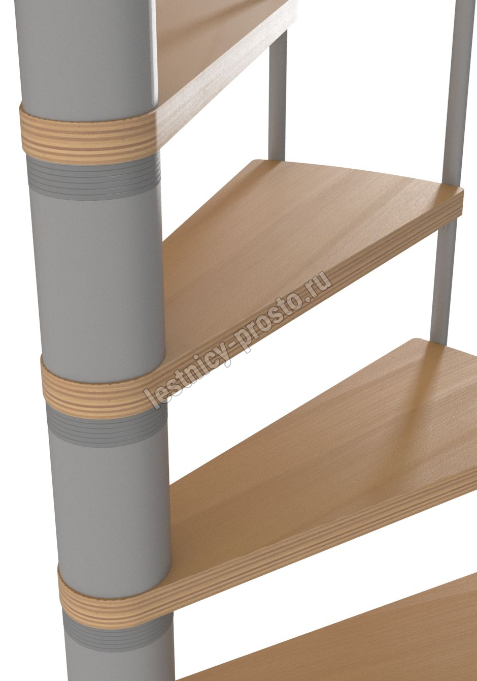 Ступени лестницы изготовлены из бука по технологии MULTIPLEX и покрыты износостойким защитным лаком. Лестница монтируется как по часовой стрелке, так и против. Возможен монтаж в круглый или квадратный проём. Ограждение: стальные трубки, Ø25 мм RAL 9006. Поручень: гибкий цельный ПВХ-поручень Ø40 мм серого цвета. Конструкция и балюстрада окрашены порошковым способом в серый цвет (RAL 9006).